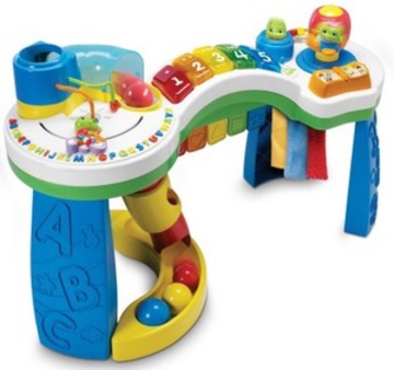 Супер игрушка со множеством функций и двумя режимами: обучение и игра - музыкальный алфавит, пианино с циферками до пяти, лоскутки разных цветов с различными текстильными свойствами, лягушонок на велосипеде, который ускоряет мелодию,  музыкальная книжка, горка для шариков (с музыкальными эффектами: детский смех, коровка-мычит, собачка-гавкает, котик мяукает и т.д), изучение форм, цветов и многое другое.Регулировка громкости, два режима: обучение и игра (со световыми и звуковыми эффектами)Столик очень устойчивый, помогает малышу вставать и удерживать равновесие, служит надежной опорой. Развивает ловкость, мышление, сообразительность.